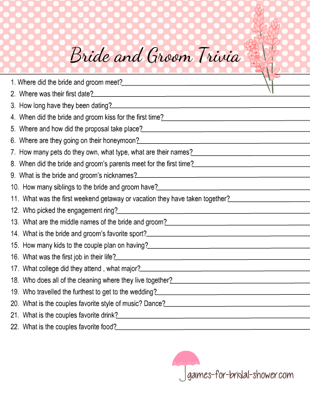 How to Play: Take printouts of these bride and groom trivia cards and ask bride and groom to be all the questions given on each card to prepare the unique answer key for the bridal shower. Distribute the cards among the guests along with a pen or pencil. Ask the guests to write down answers to the trivia questions in the spaces given in front of each question. The person whose most answers match to those given by the bride and the groom will be the winner.