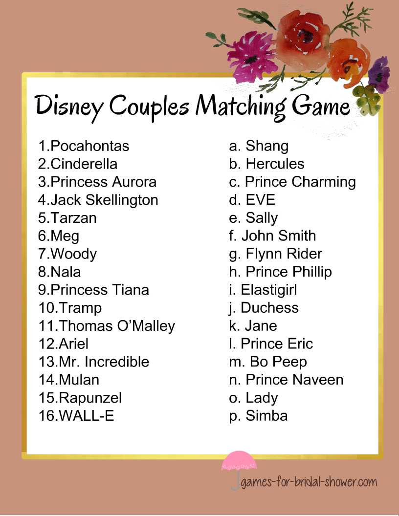Who doesn't watch Disney movies? This is a fun free printable game that I have created for your bridal shower party. The guests will have to match 16 very famous Disney couples. I have created adorable game cards in three different colors so you can download this game in the color of your choice. If kids are attending the bridal shower party, you can let them play this game as well.