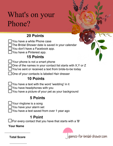 How to Play: Print the game card in color of your choice according to the number of family and friends who will be participating in bridal shower activities. . Distribute the cards among the guests along with a pen or pencil. Ask them to check the box in front of each statment given on the card. Like if someone has a white phone case, they should check the box and they will get 20 points for that. They should leave the box blank if any statement is not correct for them. Like if a person doesn't have a Pinterest app. they should leave the box given with it blank. At the end of the game each guests should count their points and write those down at the end of the game card along with their name. The person who scores maximum points will be the winner.